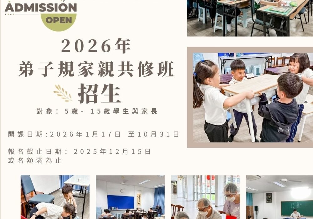 | Every Saturday from Jan 17 to Oct 30 | Dizigui Class (Parents & Child) | Course | Chinese | Parents and children(ages 5–15), and adults interested in Di Zi Gui. | Register Now |